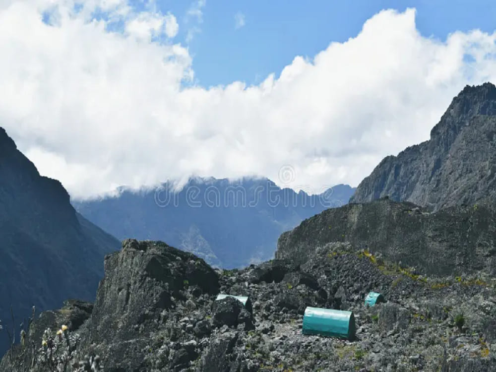 Leave the lakeside and climb steadily through the dramatic Scott Elliot Pass at 4,372 m. The trail weaves through alien-looking groundsel and lobelia forests before reaching the exposed Elena Huts, perched on rocky slopes beneath Mount Stanley. This hut serves as the base camp for summit day, and temperatures are cold with frequent mists. Spend the night preparing gear and acclimatizing for tomorrow’s climb. Hiking time is about 4–5 hours.
