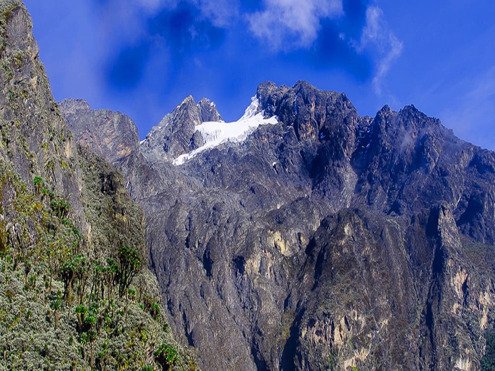 Today’s trail begins with a climb to Freshfield Pass (4,282 m), a broad alpine plateau with stunning glacier views of Mounts Baker and Stanley. Descend through bogs, rocky sections, and the Kabamba Valley, passing waterfalls and rock shelters once used by early explorers. After 6–7 hours, you reach Guy Yeoman Hut, located in a scenic valley with rivers and lush vegetation. This is your final night in the mountains.
